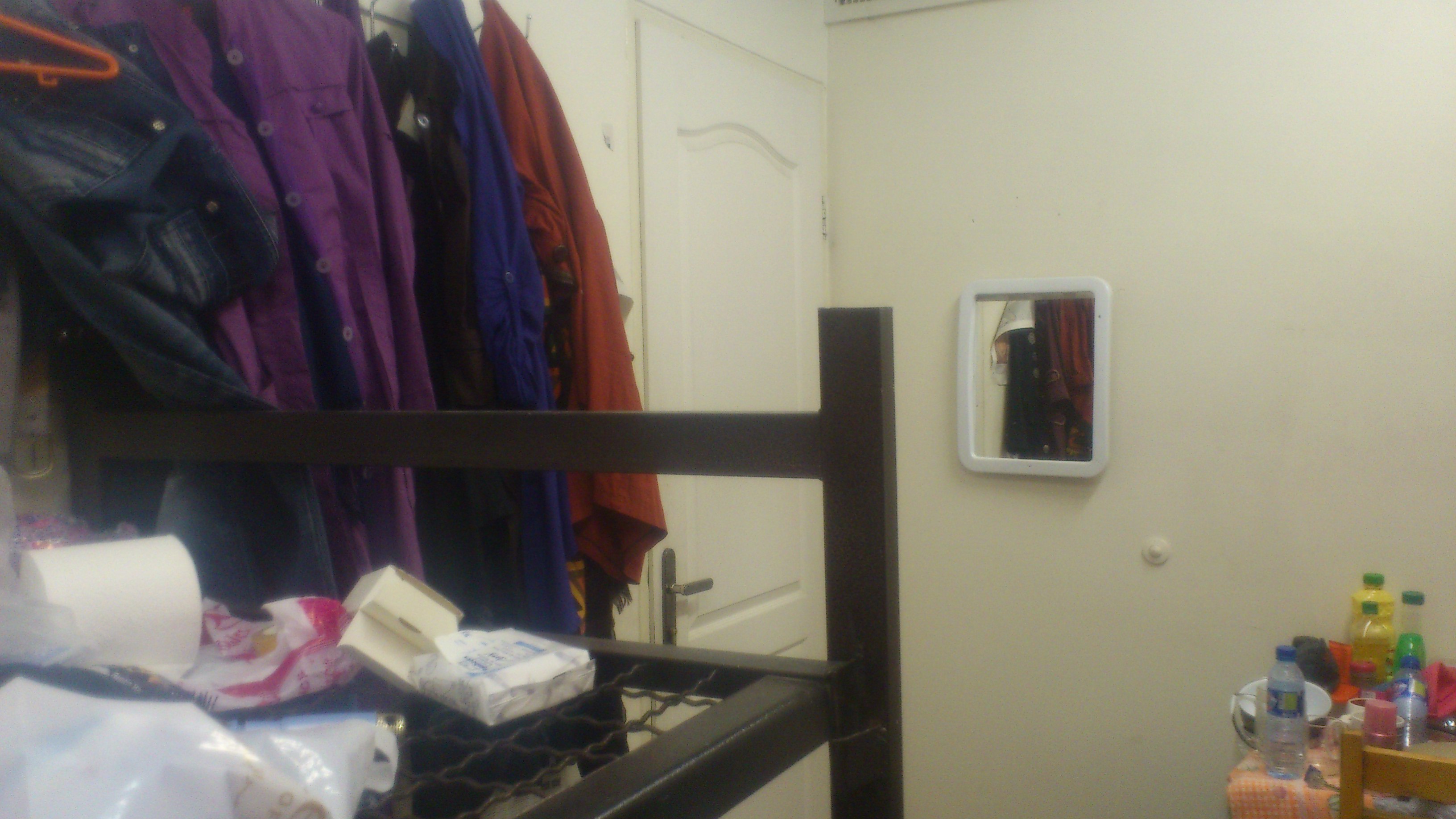 پ.ن: این اتاق در برابر اتاق اولی که رفتم خیلی بزرگه... در حالیکه اندازهی اتاق یک نفرهی خواهرمه توی خونه... اتاق اولی که رفتم توش، اینجوری بود که اینقدر توش جا نبود که نمیشد همزمان بیشتر از یک نفر از تختشون بیان پایین! اگر بیشتر از یک نفر تختشون رو ترک میکردند، دیگه روی زمین اتاق جا نمیشدند!!